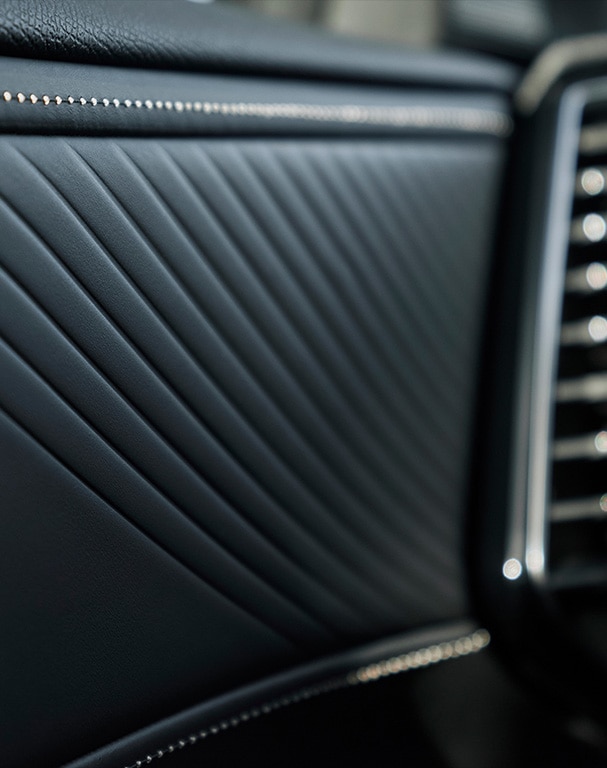 - Intérieur Alcantara® exclusif Bleu Éternel et Perle avec une gravure sur la planche bord